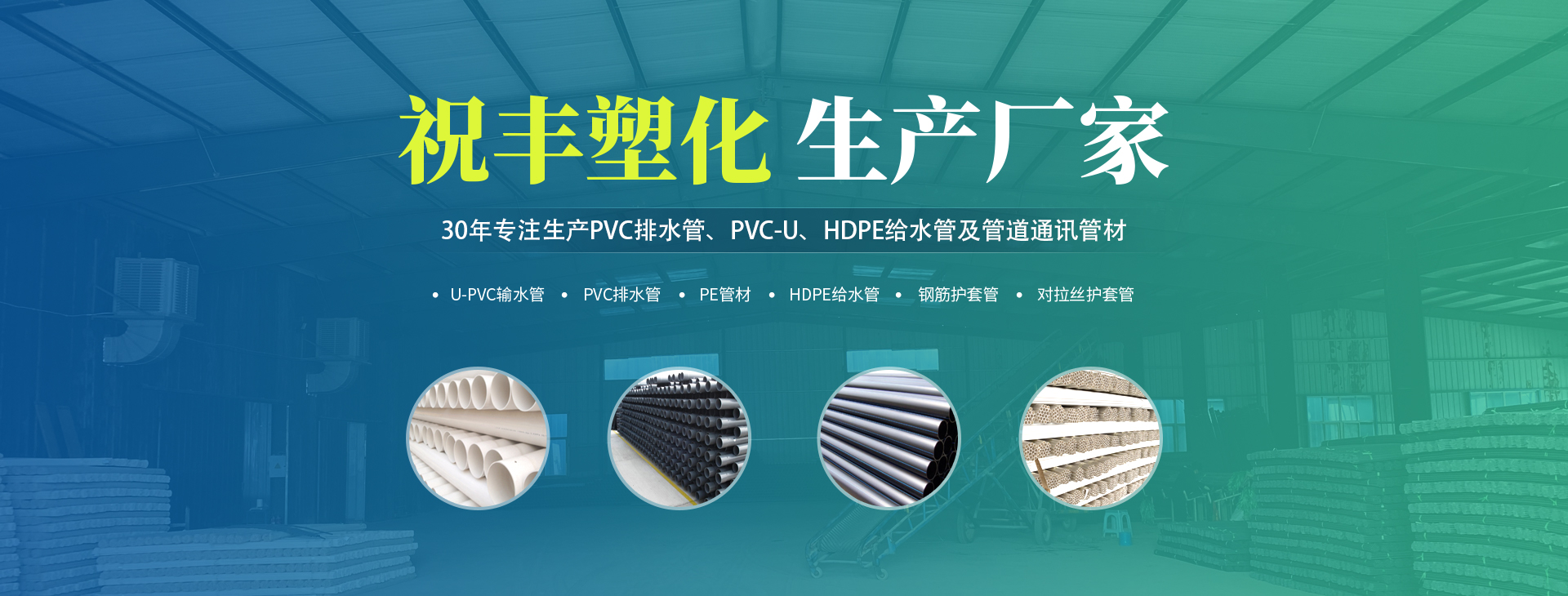 安陽(yáng)市祝豐塑化有限公司坐落在滑縣工業(yè)園區(qū),東臨大廣高速,西臨京珠高速,是鄭州、鶴壁、安陽(yáng)、濮陽(yáng)四個(gè)城市的輸紐,交通便利、環(huán)境優(yōu)美。       公司始建于八十年代,經(jīng)過(guò)二十余年的艱辛創(chuàng)業(yè),規(guī)模不斷壯大,由十多萬(wàn)元資產(chǎn)的小廠,發(fā)展到現(xiàn)占地面積達(dá)一萬(wàn)多平,建筑面積一萬(wàn)平,資產(chǎn)2000多萬(wàn)元管材生產(chǎn)企業(yè)。公司生產(chǎn)PVC-U、PVC排水管、HDPE給水管、鋼筋護(hù)套管管道通訊管材等產(chǎn)品,廣泛用于農(nóng)田節(jié)水、高山引水、人畜用水、建筑、電力通訊等多種用途,品種齊全。為了滿足用戶需求,可承攬各種給水、節(jié)水、灌溉工程?!白XS塑化”憑借強(qiáng)勁的實(shí)力,優(yōu)良的管理水平?!耙再|(zhì)量求生存,以信譽(yù)求發(fā)展”的原則全力以赴和大家共同塑造美好未來(lái)。..